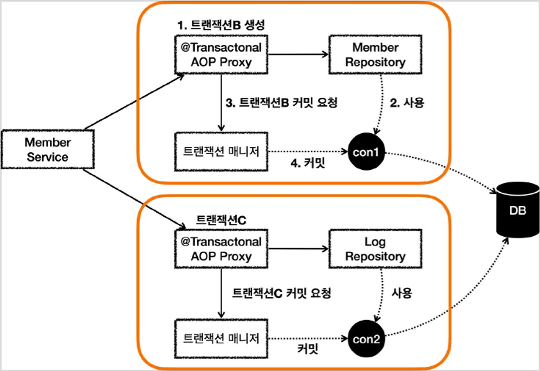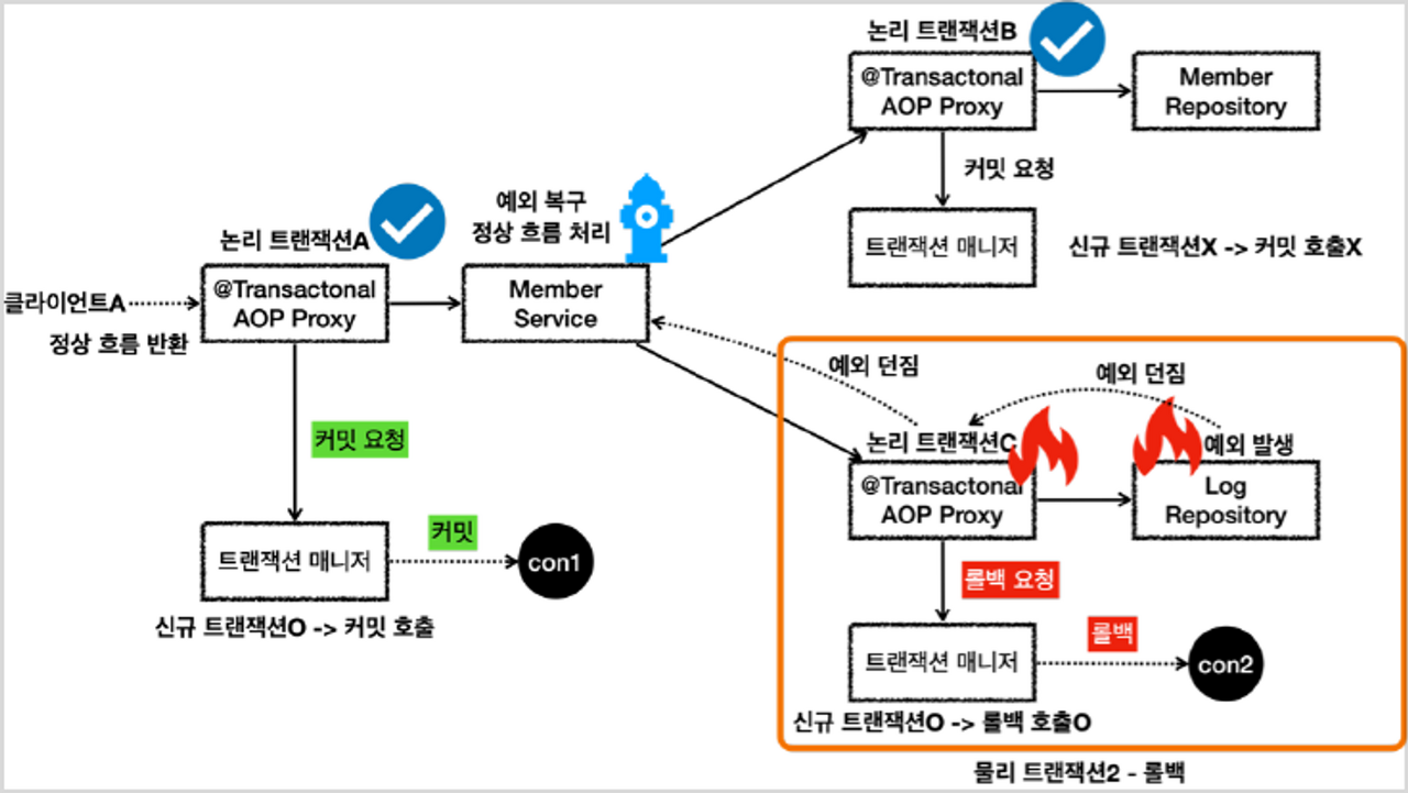 이 글은 배민 기술이사 김영한 이사님의 인프런 강의 "스프링 DB 2편 - 데이터 접근 활용 기술" 을 기반으로 작성되었습니다. 문제 시 삭제 조치하겠습니다. 아래와 같은 순서로 공부를 진행합니다. 전파 커밋 전파 롤백 복구 REQUIRED 복구 REQUIRES_NEW 3. 전파 커밋 스프링은 @Transactional이 적용되어 있으면 기본으로 REQUIRED라는 전파 옵션을 사용합니다. 이 옵션은 이전 글에서도 설명했듯 기존 트랜잭션이 없으면 트랜잭션을 생성하고, 기존 트랜잭션이 있으면 기존 트랜잭션에 참여합니다. 참여한다는 뜻은 해당 트랜잭션을 그대로 따른다는 뜻이고, 동시에 같은 동기화 커넥션을 사용한다는 의미입니다. 이렇게 둘 이상의 트랜잭션이 하나의 물리 트랜잭션에 묶이게 되면 둘을 구분하기 ..